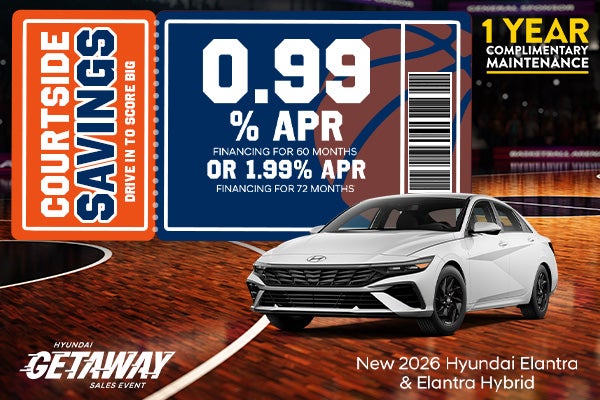 0.99% APR financing for 60 months or 1.99% APR financing for 72 months. $17.09 per month per every $1,000 borrowed at 0.99% APR; $14.75 per month per every $1,000 borrowed at 1.99% APR. With approved credit through Hyundai Motor Finance. Not all will qualify. Excludes Elantra N and Elantra N M/T. Offer applies to select new 2026 Hyundai Elantra and 2026 Hyundai Elantra Hybrid models. Several in stock at this price. Advertised Price EXCLUDES all optional dealer offered items, accessories, or product addendums optionally selected by the purchaser, applicable official taxes and fees, and a $436 documentary fee. See dealer for details. Offer Expires 03/31/2026.