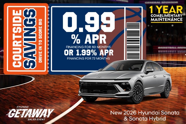 0.99% APR financing for 60 months or 1.99% APR financing for 72 months. $17.09 per month per every $1,000 borrowed at 0.99% APR; $14.75 per month per every $1,000 borrowed at 1.99% APR. With approved credit through Hyundai Motor Finance. Not all will qualify. Offer applies to select new 2026 Hyundai Sonata and 2026 Hyundai Sonata Hybrid models. Several in stock at this price. Advertised Price EXCLUDES all optional dealer offered items, accessories, or product addendums optionally selected by the purchaser, applicable official taxes and fees, and a $436 documentary fee. See dealer for details. Offer Expires 03/31/2026.