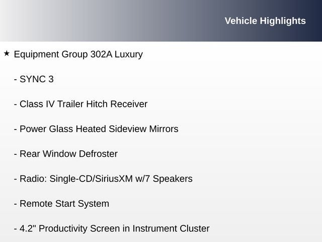 - SYNC -inc: enhanced voice recognition communications and entertainment system, 911 assist, 4.2" LCD display in center stack, Applink and 1 smart charging USB port