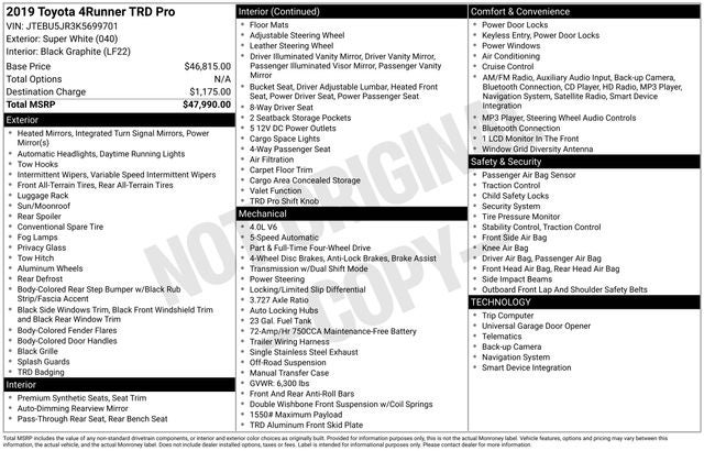 Super White 2019 Toyota 4Runner TRD Pro 4WD 5-Speed Automatic with Overdrive 4.0L V6 SMPI DOHC WE DELIVER ANYWHERE, 4WD, Black Graphite w/Nightshade Leather Seat Trim, Auto-Dimming Rear-View Mirror, Garage Door Opener, Power Tilt & Slide Moonroof w/Sunshade, TRD Badging, TRD Pro Floor Mats, TRD Pro Package, TRD Pro Shift Knob, TRD Roof Rack, TRD Suspension Kit, 3.727 Axle Ratio, 4-Wheel Disc Brakes, 8 Speakers, ABS brakes, Air Conditioning, Alloy wheels, AM/FM radio: SiriusXM, Anti-whiplash front head restraints, Auto-dimming Rear-View mirror, Brake assist, Bumpers: body-color, CD player, Compass, Driver door bin, Driver vanity mirror, Dual front impact airbags, Dual front side impact airbags, Electronic Stability Control, Emergency communication system: Safety Connect, Exterior Parking Camera Rear, Front anti-roll bar, Front Bucket Seats, Front Center Armrest, Front fog lights, Front reading lights, Front wheel independent suspension, Garage door transmitter: HomeLink, Heated door mirrors, Heated Front Bucket Seats, Heated front seats, Illuminated entry, Knee airbag, Leather Shift Knob, Low tire pressure warning, Navigation System, Occupant sensing airbag, Outside temperature display, Overhead airbag, Overhead console, Panic alarm, Passenger door bin, Passenger vanity mirror, Power door mirrors, Power driver seat, Power moonroof, Power passenger seat, Power steering, Power windows, Radio: Entune Premium Audio w/Navigation, Rear anti-roll bar, Rear seat center armrest, Rear window defroster, Rear window wiper, Remote keyless entry, Roof rack, Security system, Softex Synthetic Leather Seat Trim, Speed control, Speed-sensing steering, Split folding rear seat, Spoiler, Steering wheel mounted audio controls, Tachometer, Telescoping steering wheel, Tilt steering wheel, Traction control, Trip computer, Turn signal indicator mirrors, Variably intermittent wipers, Wheels: TRD 17 Matte Black Alloy, 4WD, Black Graphite w/Nightshade Leather Seat Trim, Auto-Dimming Rear-View Mirror, Garage Door Opener, Power Tilt & Slide Moonroof w/Sunshade, TRD Badging, TRD Pro Floor Mats, TRD Pro Package, TRD Pro Shift Knob, TRD Roof Rack, TRD Suspension Kit.