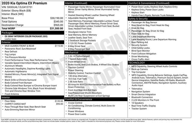 CARFAX One-Owner. Clean CARFAX. Ebony Black 2020 Kia Optima EX Premium Turbo FWD 7-Speed Automatic 1.6L I4 DOHC 10 Speakers, 4-Wheel Disc Brakes, ABS brakes, Air Conditioning, Alloy wheels, AM/FM radio: SiriusXM, Anti-whiplash front head restraints, Apple CarPlay & Android Auto, Auto High-beam Headlights, Auto-dimming Rear-View mirror, Automatic temperature control, Brake assist, Bumpers: body-color, Carpet Cargo Mat, Carpet Floor Mats, Delay-off headlights, Driver door bin, Driver vanity mirror, Dual front impact airbags, Dual front side impact airbags, Electronic Stability Control, Emergency communication system: UVO eServices, EX Gray Interior Color Package, Four wheel independent suspension, Front anti-roll bar, Front Bucket Seats, Front Center Armrest, Front dual zone A/C, Front fog lights, Front reading lights, Fully automatic headlights, Heated & Ventilated Front Bucket Seats, Heated door mirrors, Heated front seats, Heated steering wheel, Illuminated entry, Knee airbag, Leather Seat Trim, Leather Shift Knob, Leather steering wheel, Low tire pressure warning, Memory seat, Mud Guards Front & Rear, Navigation System, Occupant sensing airbag, Outside temperature display, Overhead airbag, Overhead console, Panic alarm, Passenger door bin, Passenger vanity mirror, Power door mirrors, Power driver seat, Power moonroof, Power passenger seat, Power steering, Power windows, Radio data system, Radio: harman/kardon AM/FM/MP3/SiriusXM Audio, Rear anti-roll bar, Rear reading lights, Rear seat center armrest, Rear window defroster, Remote keyless entry, Security system, Speed control, Speed-sensing steering, Split folding rear seat, Steering wheel mounted audio controls, Tachometer, Telescoping steering wheel, Tilt steering wheel, Traction control, Trip computer, Turn signal indicator mirrors, Two-Tone Leather Seats, Variably intermittent wipers, Ventilated front seats, Wheels: 6.5J x 17 Machine Finish Alloy.