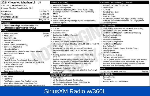 Shadow Gray Metallic 2021 Chevrolet Suburban LS RWD 10-Speed Automatic with Overdrive EcoTec3 5.3L V8 WE DELIVER ANYWHERE, 1st & 2nd Row Color-Keyed Carpeted Floor Mats, 2 USB Data Ports, Color-Keyed Carpeting Floor Covering, Driver & Front Outboard Passenger Airbags, Floor Console w/Storage Area, HD Radio, Infotainment Display, Leather-Wrapped Steering Wheel, LED Daytime Running Lamps, Preferred Equipment Group 1LS, Remote Start, SiriusXM Radio w/360L, 3.23 Rear Axle Ratio, 3rd row seats: split-bench, 4-Wheel Disc Brakes, 6 Speakers, ABS brakes, Air Conditioning, Alloy wheels, AM/FM radio: SiriusXM with 360L, Apple CarPlay/Android Auto, Auto High-beam Headlights, Automatic temperature control, Brake assist, Bumpers: body-color, Compass, Delay-off headlights, Driver door bin, Driver vanity mirror, Dual front impact airbags, Dual front side impact airbags, Electronic Stability Control, Emergency communication system: OnStar and Chevrolet connected services capable, Four wheel independent suspension, Front anti-roll bar, Front Bucket Seats, Front Center Armrest, Front dual zone A/C, Front reading lights, Fully automatic headlights, Heated door mirrors, Illuminated entry, Leather steering wheel, Low tire pressure warning, Occupant sensing airbag, Outside temperature display, Overhead airbag, Overhead console, Panic alarm, Passenger door bin, Passenger vanity mirror, Polished Exhaust Tip, Power door mirrors, Power driver seat, Power passenger seat, Power steering, Power windows, Premium audio system: Chevrolet Infotainment 3 Plus, Premium Cloth Seat Trim, Premium Smooth Ride Suspension, Radio: Chevrolet Infotainment 3 Plus System, Rain sensing wipers, Rear air conditioning, Rear anti-roll bar, Rear reading lights, Rear seat center armrest, Rear window defroster, Rear window wiper, Remote keyless entry, Roof rack: rails only, Security system, Speed control, Speed-sensing steering, Split folding rear seat, Spoiler, Steering wheel mounted audio controls, Tachometer, Telescoping steering wheel, Tilt steering wheel, Traction control, Trip computer, Variably intermittent wipers, Voltmeter, Wheel Locks (Set of 4) (LPO), Wheels: 18 x 8.5 Bright Silver Painted Aluminum, Wheels: 20 x 9 Painted Aluminum, 1st & 2nd Row Color-Keyed Carpeted Floor Mats, 2 USB Data Ports, Color-Keyed Carpeting Floor Covering, Driver & Front Outboard Passenger Airbags, Floor Console w/Storage Area, HD Radio, Infotainment Display, Leather-Wrapped Steering Wheel, LED Daytime Running Lamps, Preferred Equipment Group 1LS, Remote Start, SiriusXM Radio w/360L.