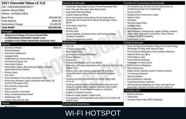 Packed with an array of premium features, this Tahoe LS is designed to make your life easier and more convenient. Enjoy the convenience of a Backup Camera, Bluetooth® connectivity, Android Auto/Apple CarPlay, and a Wi-Fi Hotspot. Remote Start and Keyless Entry add to the Tahoe's user-friendly experience, while the 3rd Row Seating and Heavy Duty Towing Package make it the perfect companion for your adventures.
