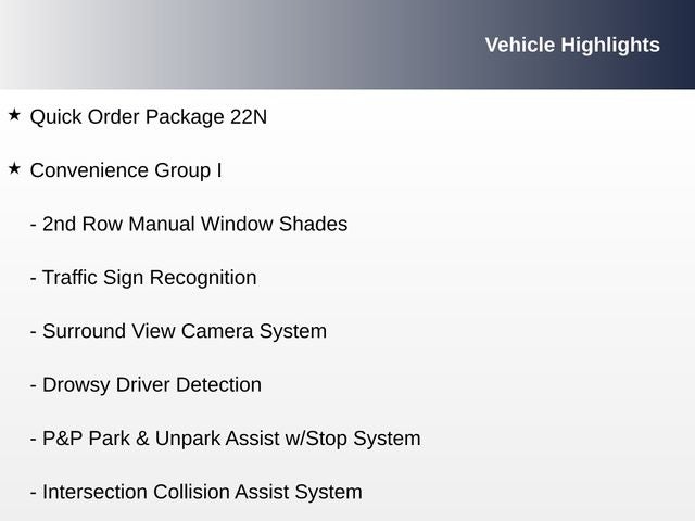 • Convenience Group I: Surround View Camera System, 2nd Row Manual Window Shades, Park & Unpark Assist, Drowsy Driver Detection, Intersection Collision Assist, Traffic Sign Recognition