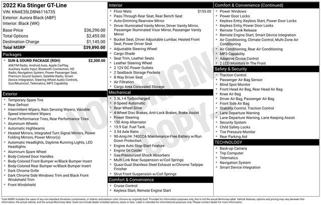 Boasting a robust I4 engine paired with an 8-Speed Automatic transmission and rear-wheel drive, the Stinger GT-Line delivers an exhilarating driving experience. Enjoy impressive fuel efficiency, with an EPA-estimated 22 city/32 highway MPG, ensuring you can go the distance without frequent stops.
