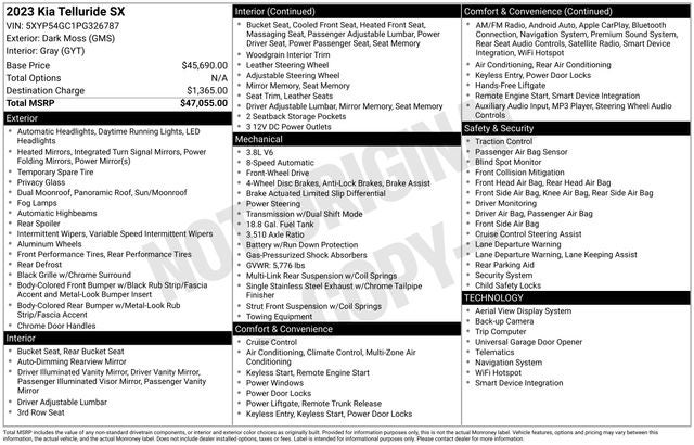 CARFAX One-Owner. Dark Moss 2023 Kia Telluride SX FWD 8-Speed Automatic 3.8L V6 DGI DOHC Dual CVVT 10 Speakers, 3.510 Axle Ratio, 3rd row seats: split-bench, 4-Wheel Disc Brakes, ABS brakes, Air Conditioning, Alloy wheels, AM/FM radio: SiriusXM, Apple CarPlay & Android Auto, Auto High-beam Headlights, Auto-dimming Rear-View mirror, Automatic temperature control, Brake assist, Bumpers: body-color, Compass, Delay-off headlights, Driver door bin, Driver vanity mirror, Dual front impact airbags, Dual front side impact airbags, Electronic Stability Control, Emergency communication system: 911 Connect, Exterior Parking Camera Rear, Four wheel independent suspension, Front anti-roll bar, Front Bucket Seats, Front Center Armrest, Front dual zone A/C, Front fog lights, Front reading lights, Fully automatic headlights, Garage door transmitter: HomeLink, harman/kardon® Speakers, Heated & Ventilated Front Bucket Seats, Heated door mirrors, Heated front seats, Illuminated entry, Knee airbag, Leather Seat Trim, Leather Shift Knob, Leather steering wheel, Low tire pressure warning, Memory seat, Navigation System, Occupant sensing airbag, Outside temperature display, Overhead airbag, Overhead console, Panic alarm, Passenger door bin, Passenger vanity mirror, Power door mirrors, Power driver seat, Power Liftgate, Power moonroof, Power passenger seat, Power steering, Power windows, Radio data system, Radio: AM/FM harman/kardon Premium Audio System, Rear air conditioning, Rear anti-roll bar, Rear audio controls, Rear reading lights, Rear side impact airbag, Rear window defroster, Rear window wiper, Reclining 3rd row seat, Remote keyless entry, Roof rack: rails only, Security system, Smart Key w/ Push Button and Remote Start, Speed control, Speed-sensing steering, Split folding rear seat, Spoiler, Steering wheel mounted audio controls, Tachometer, Telescoping steering wheel, Tilt steering wheel, Traction control, Trip computer, Turn signal indicator mirrors, Variably intermittent wipers, Ventilated front seats, Wheels: 20 x 7.5 Black Finish.