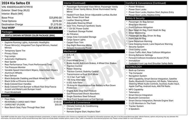 Boasting a spacious and refined interior, the Seltos EX offers the perfect balance of comfort and convenience. Enjoy the convenience of features like Apple CarPlay & Android Auto, Leather Shift Knob, and Leather steering wheel, all designed to enhance your daily commute. The Seltos EX's impressive fuel efficiency, with an EPA-estimated 28 city/34 highway MPG, makes it an exceptional choice for those seeking both performance and efficiency.