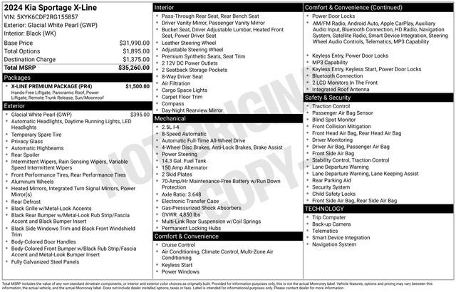 Elevate your driving experience with the impressive features of the Sportage X-Line. The available X-Line Premium Package elevates your journey, offering a Smart Power Liftgate for effortless loading, LED interior lighting for a sophisticated ambiance, and a panoramic sunroof to let the outside in. With its impressive all-wheel-drive capability and efficient 8-speed automatic transmission, this Sportage is ready to tackle any adventure with confidence.