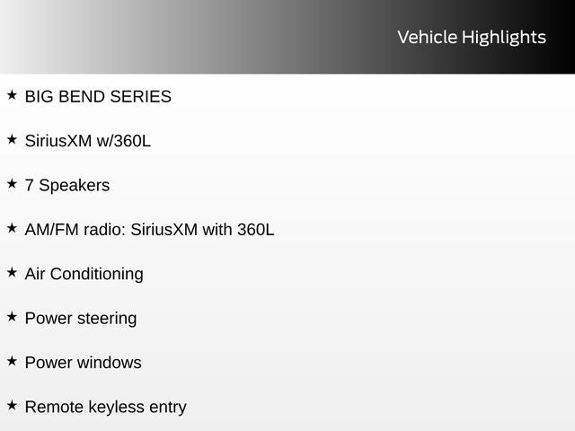 Whether you're seeking a capable off-road companion or a versatile daily driver, the 2025 Ford Bronco Big Bend is the perfect choice. Experience the thrill of the open road and the untamed wilderness with this exceptional SUV. Visit our showroom today and let us demonstrate why the Bronco Big Bend is the ultimate expression of Ford's legendary off-road heritage.