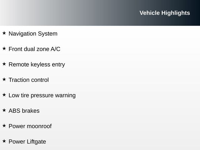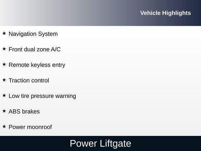 AWD, ABS brakes, Active Cruise Control, Alloy wheels, Electronic Stability Control, Front dual zone A/C, Heated & Ventilated Front Bucket Seats, Heated door mirrors, Heated front seats, Illuminated entry, Low tire pressure warning, Navigation System, Power Liftgate, Power moonroof, Remote keyless entry, Traction control.